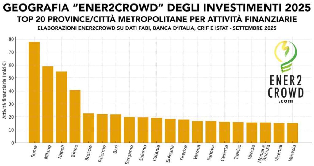 Ener2Crowd ha infine stimato la ripartizione provinciale e per aree metropolitane delle attività finanziarie, stimandole proporzionalmente a ciascuna regione in base a coefficienti demografici di ciascuna singola provincia e città metropolitana. Ecco la “Geografia provinciale Ener2Crowd degli investimenti 2025”: