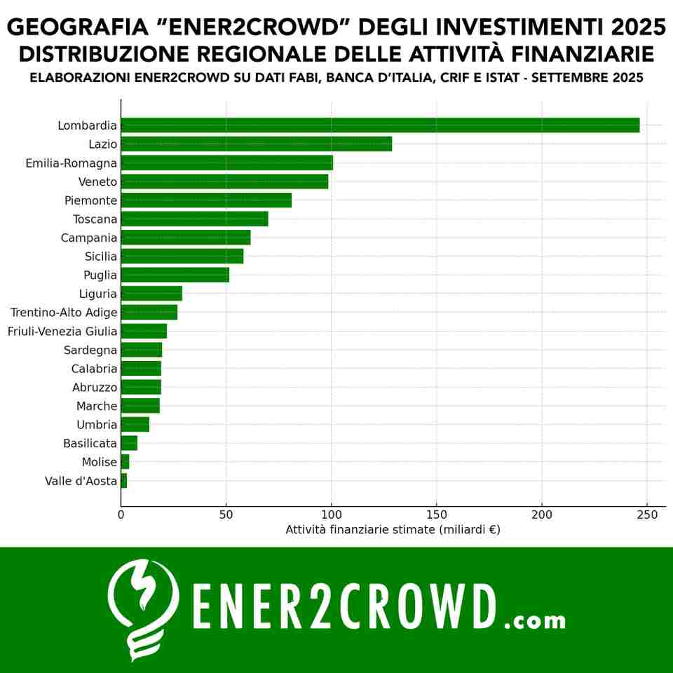 Ed ecco la ripartizione regionale delle attività finanziarie calcolata da Ener2Crowd in base al peso del PIL di ciascuna regione: